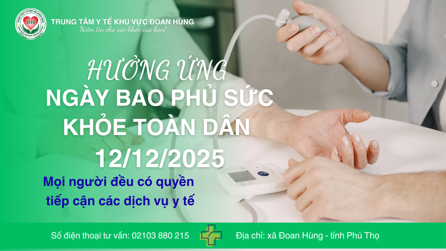 Nhân Ngày Bao phủ Sức khỏe Toàn dân 12/12, Trung tâm Y tế Khu vực Đoan Hùng trân trọng gửi tới nhân dân thông điệp: Sức khỏe là quyền cơ bản của mỗi con người, và mọi người dân đều xứng đáng được tiếp cận dịch vụ y tế chất lượng, công bằng, không phân biệt độ tuổi, giới tính, nghề nghiệp hay hoàn cảnh sống.
